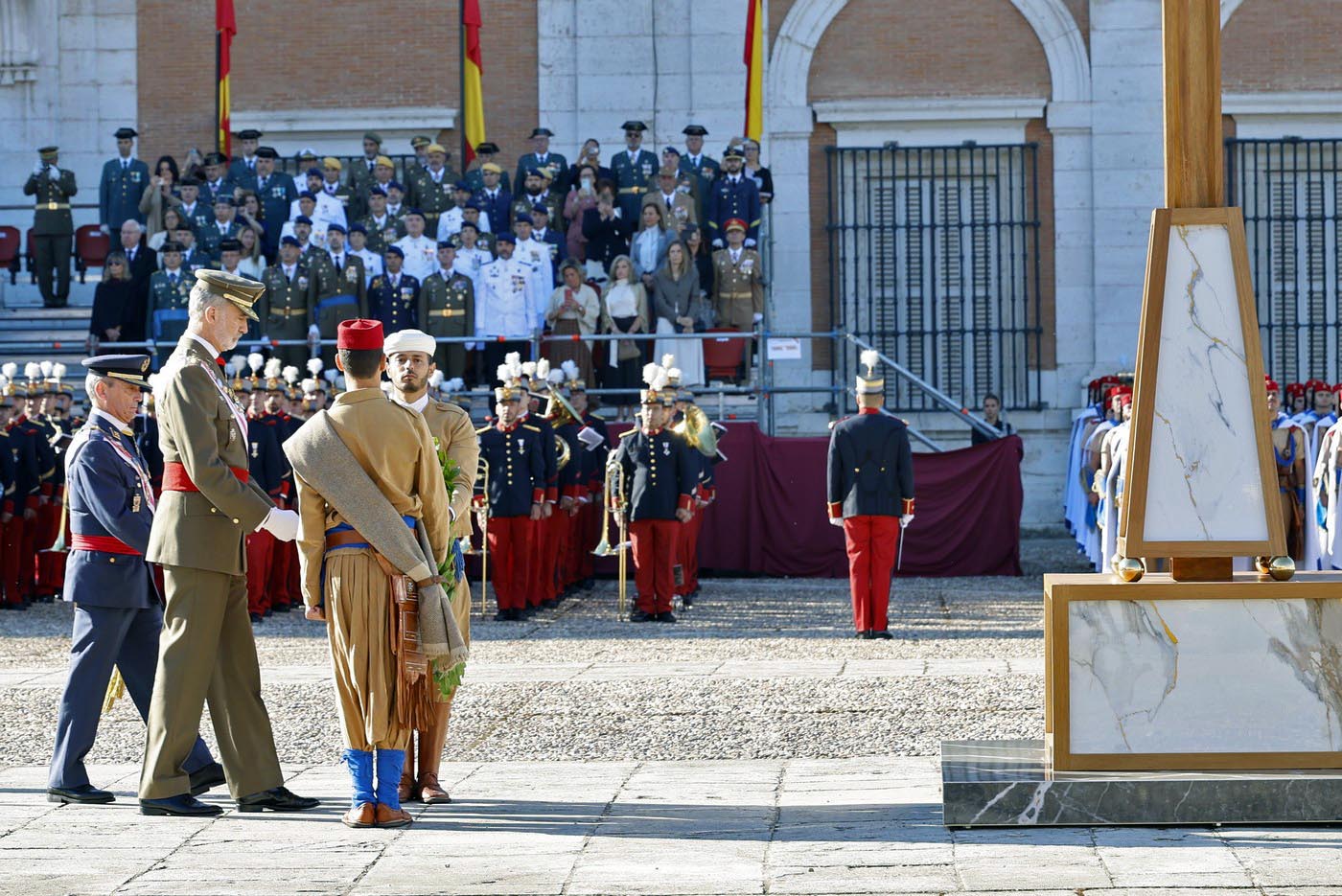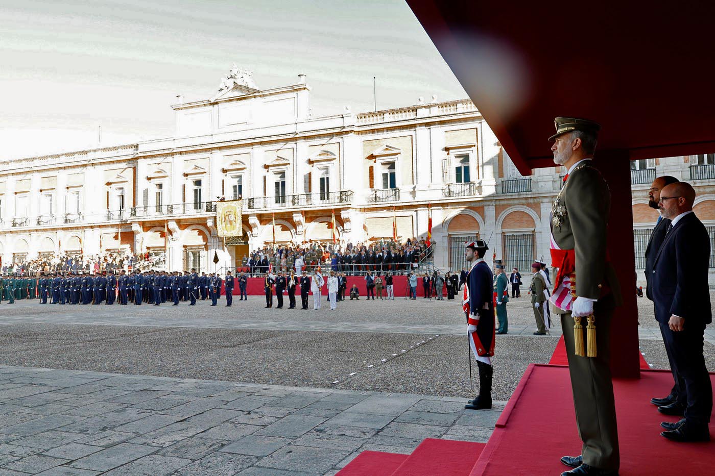 La ceremonia comenzó con la recepción a Su Majestad el Rey en el Patio de Armas del Palacio Real de Aranjuez, quien, tras recibir la bengala de mando, pasó revista a las tropas. Un momento de especial significación fue el saludo a las tres únicas unidades que portan el guion-enseña de la Orden: la Compañía de Mar de Ceuta, la Compañía de Mar de Melilla y el Grupo Naval de Playa, distinción que las acredita como colectivos de valor excepcional.
